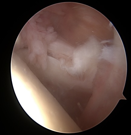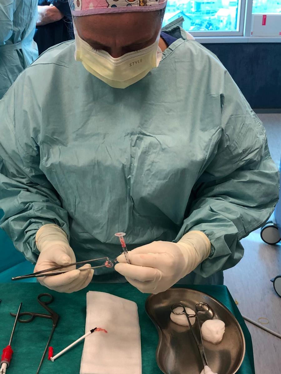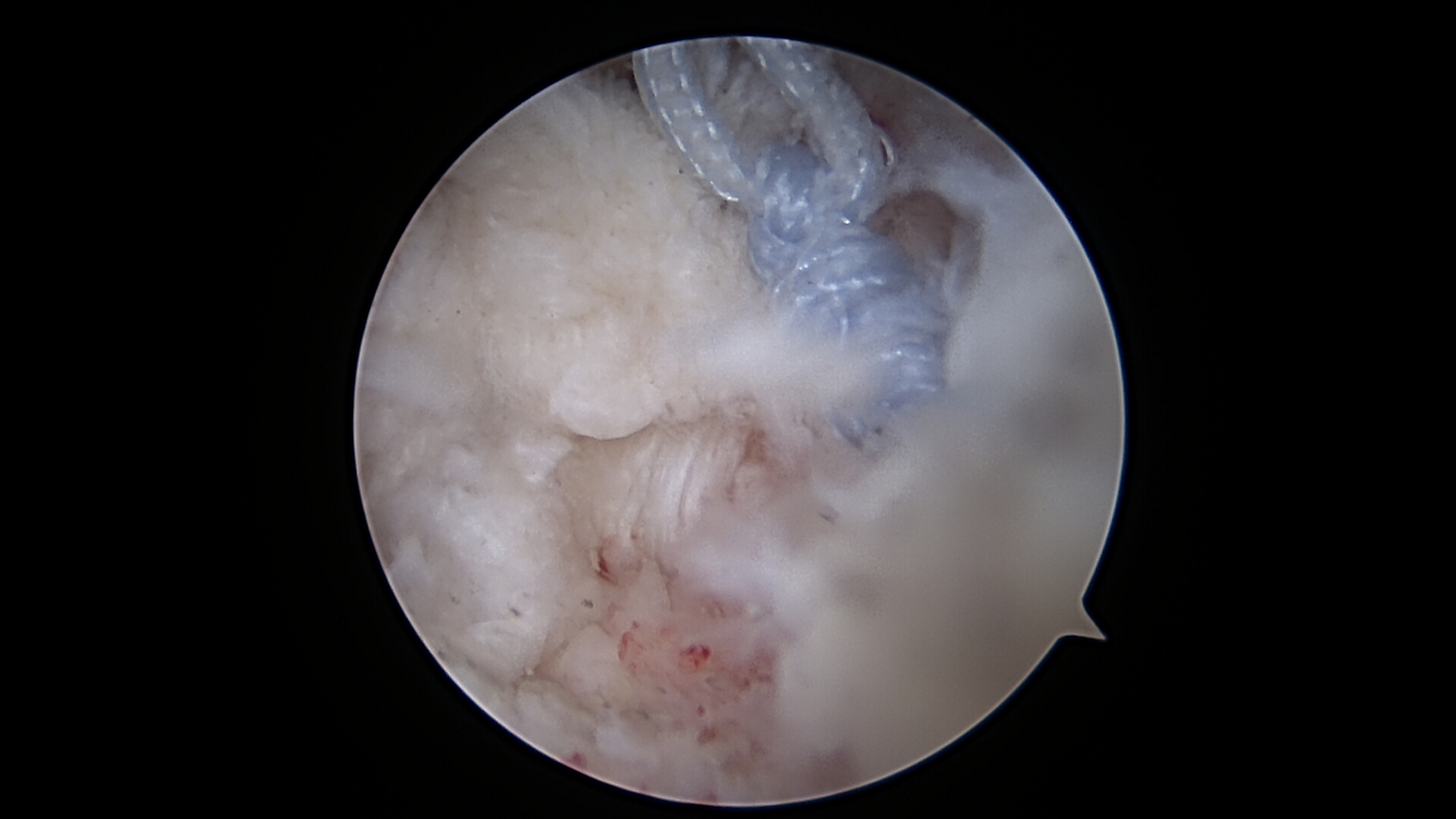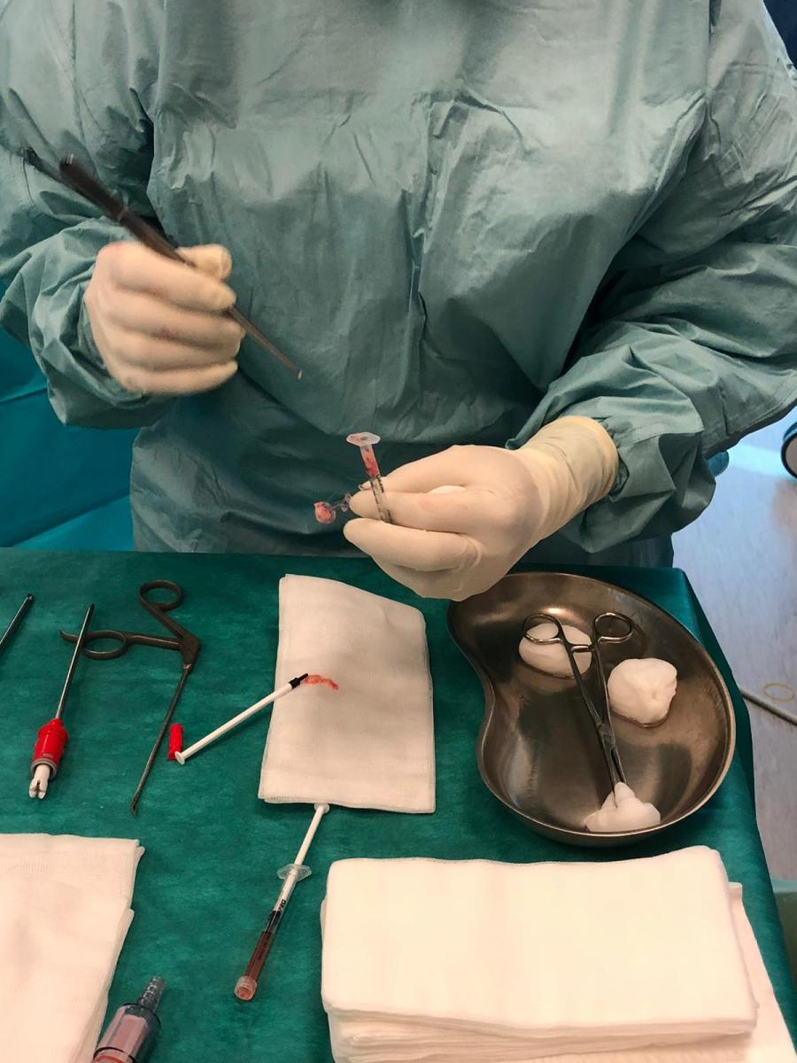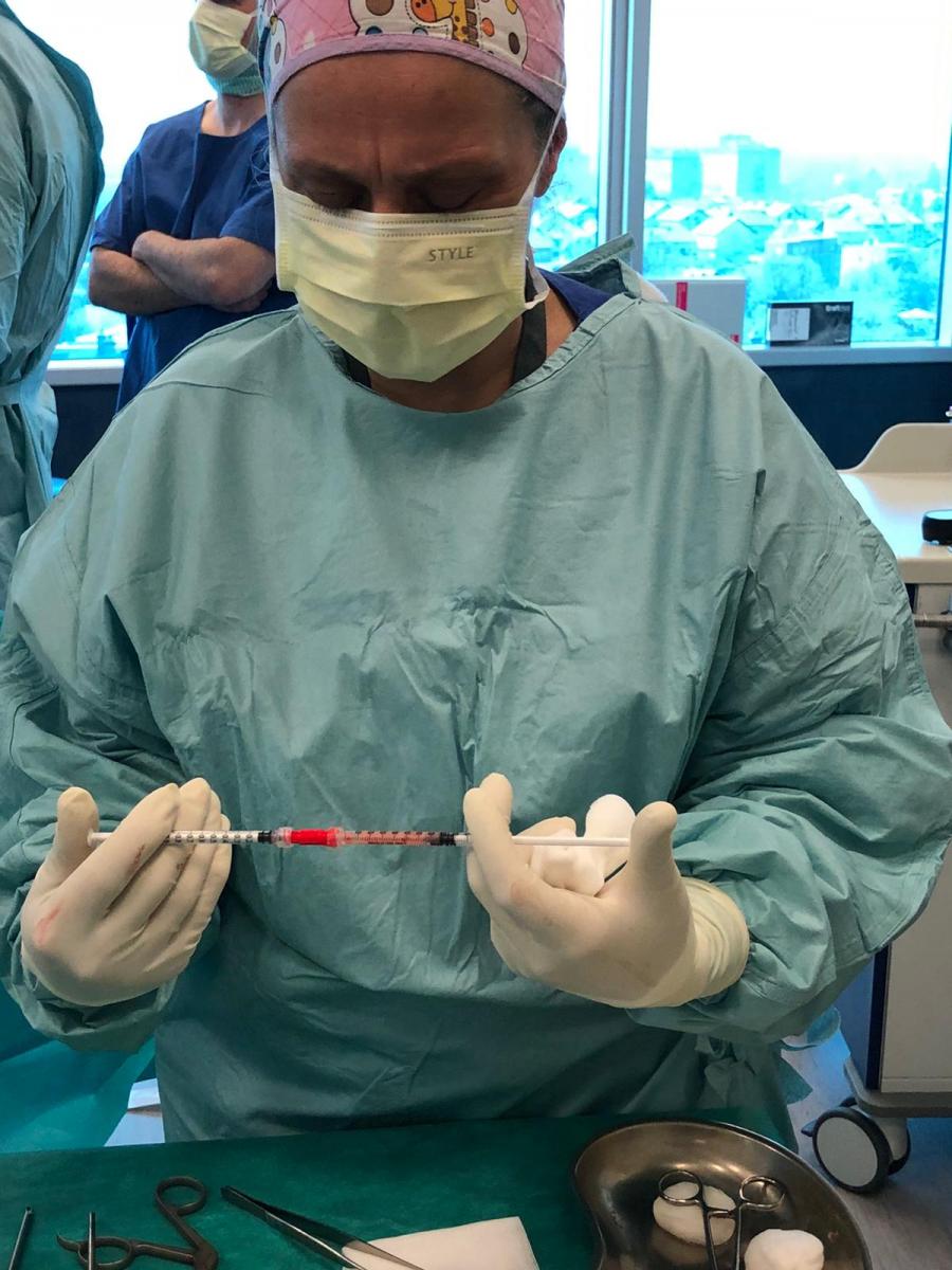 Specifičnost ove operacije je u tome što se na mjesto puknuća tetive, koja je atroskopski ponovno spojena, precizno aplicira mješavina matičnih mezenhimalnih stanica i plazme bogate trombocitima (slika 9), što pospješuje cijeljenje tetive s dva aspekata – kroz ubrzanje procesa cijeljenja i regeneracije tetive, kao i kroz kvalitetu tetive u području rupture odnosno njenog rekonstruiranog dijela. (slika 10)